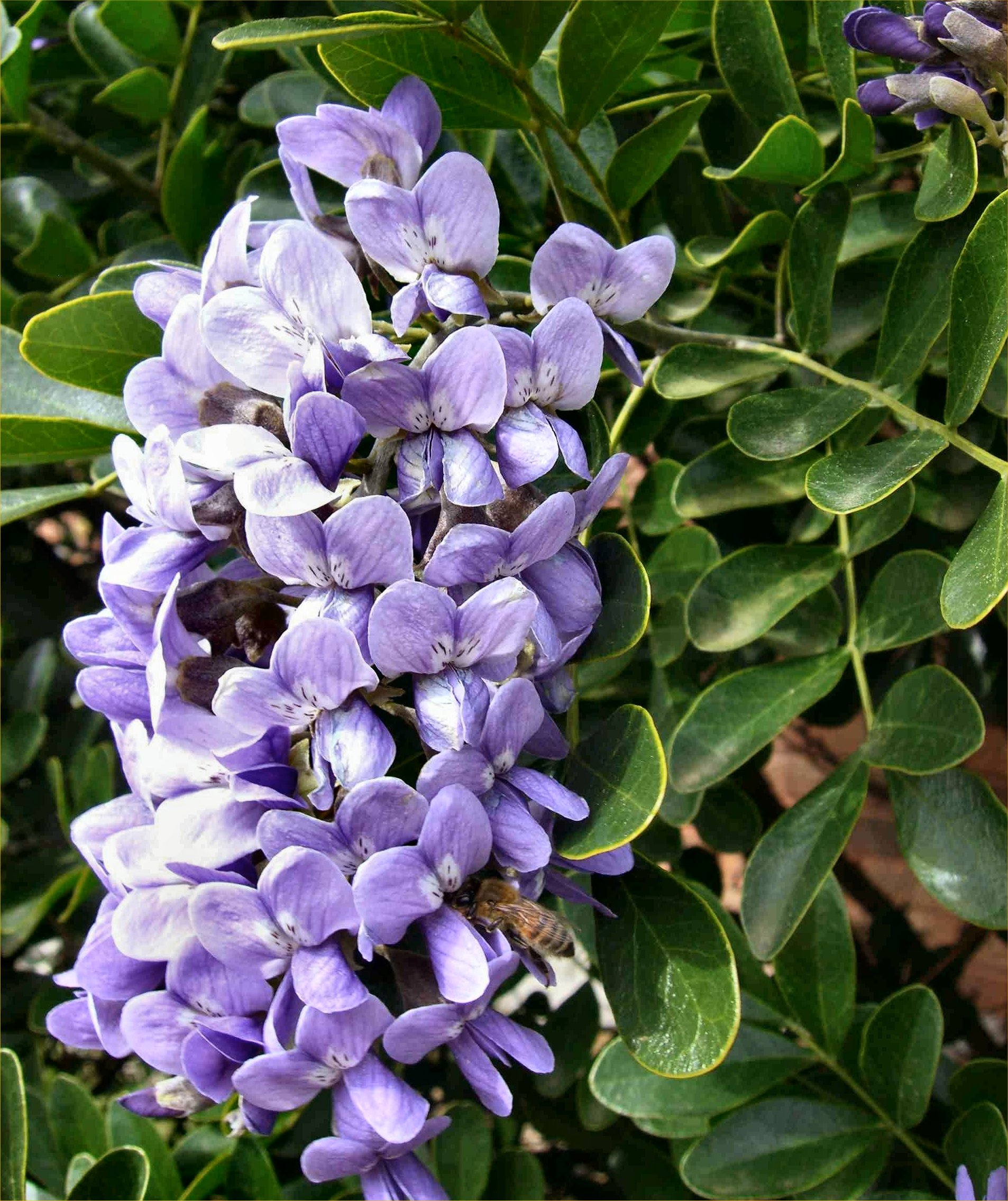 It’s not the tree pollen, or the grass growing, or the birds that stop to visit as they migrate north that tell me spring has arrived. No, I know spring is here because my beloved Texas mountain laurels are blooming. Have you ever seen a Texas mountain laurel in bloom? They’re spectacular. The trees are lovely any time of year with their shiny oval leaves, but it’s the blooms that knock you out. They grow in clusters like grapes or wisteria, and they have the most intoxicating aroma of grape jelly. Seriously. When you smell them, you immediately think of a big jar of Welch’s grape jelly. It’s heavenly. The problem is that it’s also short-lived. Those gorgeous, fruity blooms only last a week or two and they’re gone. I’m sharing them with you before it’s too late. If only we had smellavision.