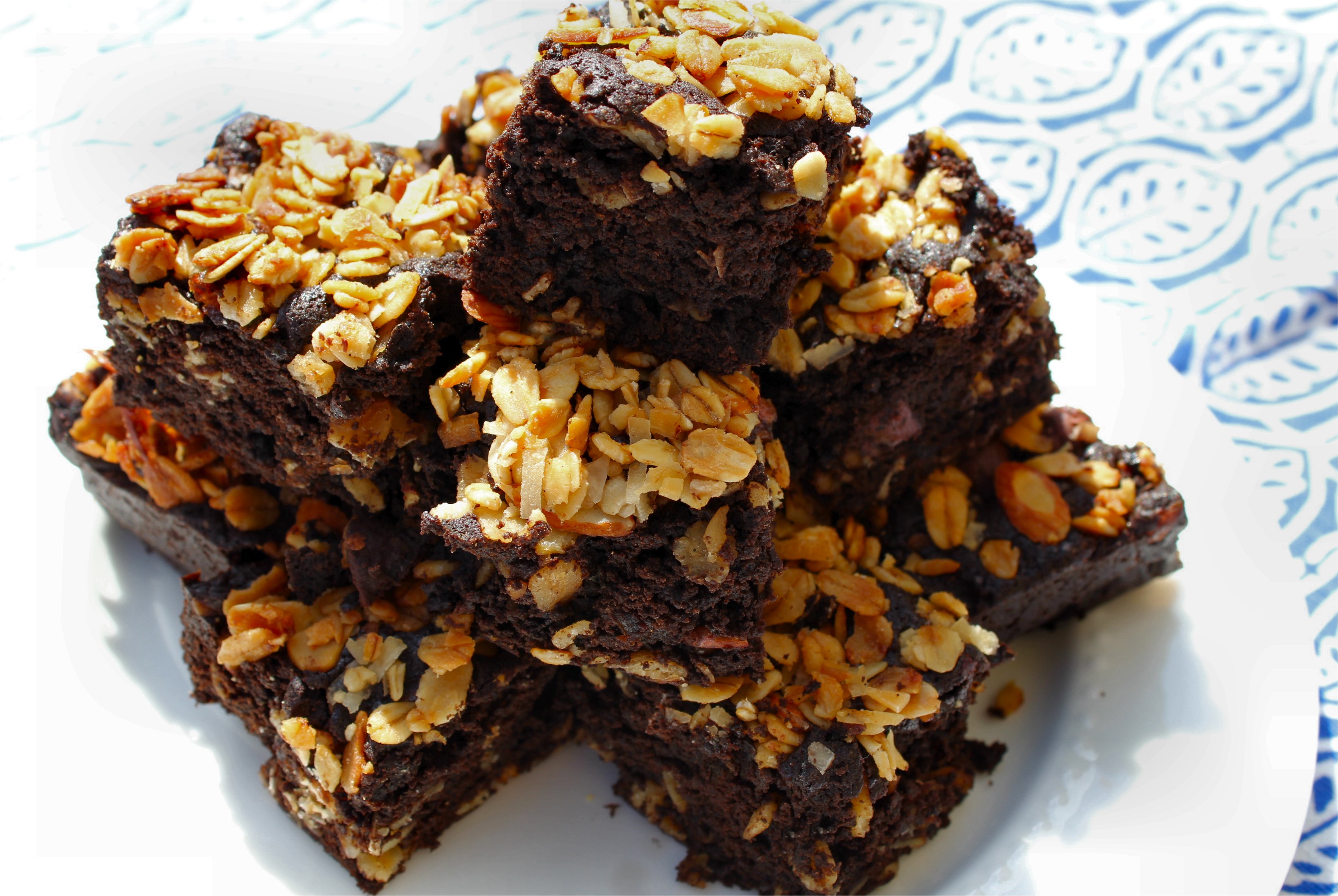 Last week, I experienced a “fail” on a first-time recipe. I attempted to make homemade granola bars with chopped dates, coconut, almonds and dark chocolate chips. While it tasted spectacular, the bars just never stuck together. Guess my granola mix was too dry. Next time, I’ll add more honey. BUT… from lemons we make lemonade, and from failed granola bars, we make granola (which was great over Greek yogurt, by the way). And since I can can never seem to leave anything alone, I decided to kick it up a notch by making granola brownies. I mean, it makes sense in an unconventional way. Oats are good with chocolate. So are almonds, dates and coconut. And nothing satisfies a craving for sweets like a brownie, so…