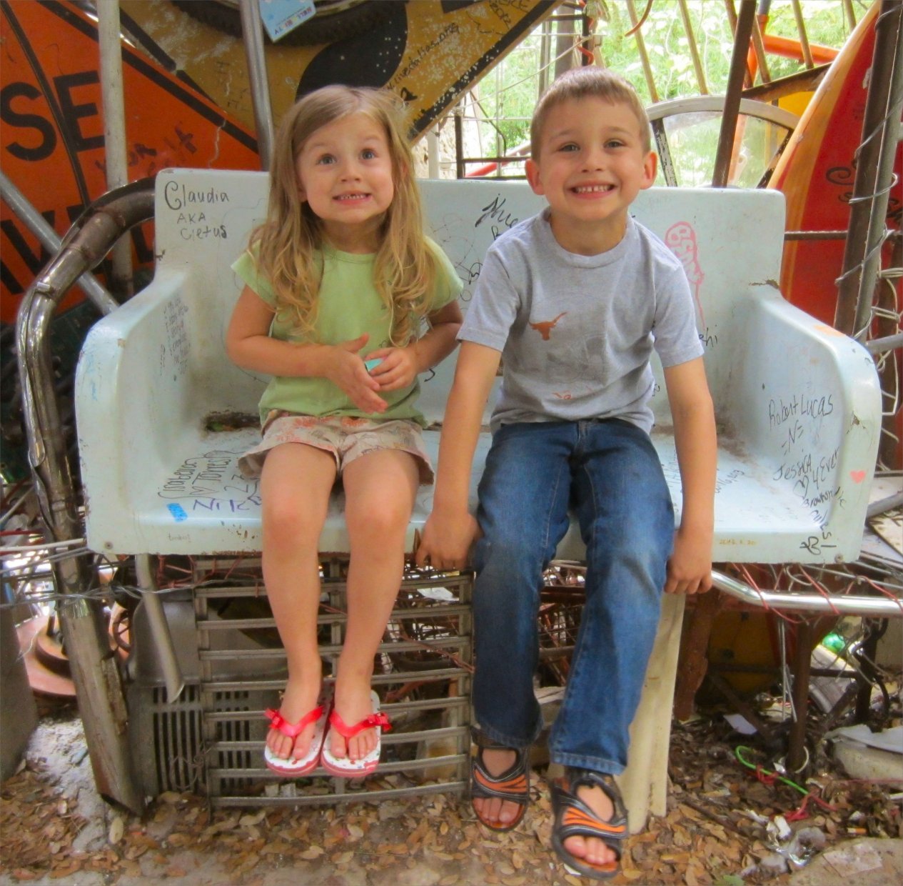 We recently spent a weekend in Austin with our grandkids and during that weekend The Complete Package took us out for street food and a sight-seeing adventure at the Cathedral of Junk. Never heard of it? Neither had I, and neither had My Baby who lives in Austin and attended college there {hook ’em}. How TCP knew is beyond us, but he did and we’re glad he did. The Cathedral of Junk is hard to describe, wonderous to behold, and one of a kind. Here’s a peek.