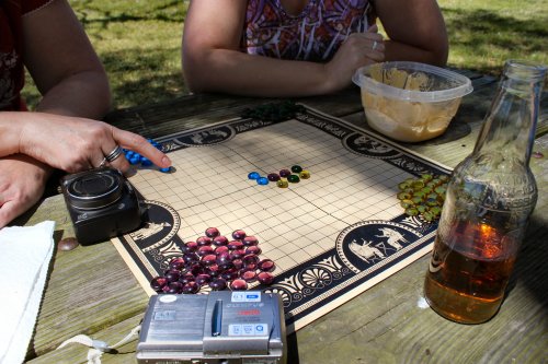 There’s something about a picnic on a lake, under a live oak with nothing but the sound of birds chirping that’s just good for the soul. I can’t describe how relaxing it was. While we ate, we broke out the Pente board. Pente was really big back in the early 80’s, if you’re old enough to remember it. We played Pente several times while the girls were here. If you’re not familiar with posts about my family, we’re big into playing cards and board games. Sometimes we even break out the 1,000 piece puzzles. Scrabble, Phase 10 and Cranium rate high on our list, too. Subconsciously, I think we’re all hoping that this ritual of working our brains will help keep senility at bay. Check back in 20 years, and I’ll let you know how that worked out. But on this day, we kept our brain cells hopping with a little low-level strategy and bead stealing while we fed the ravens and grackles.