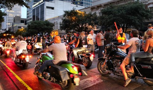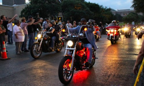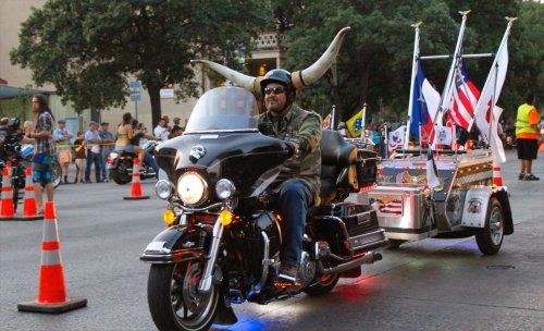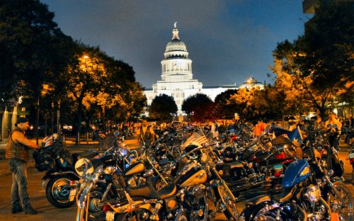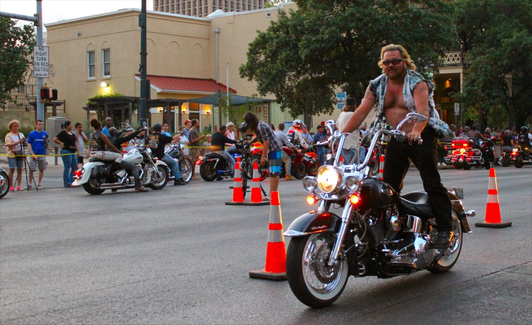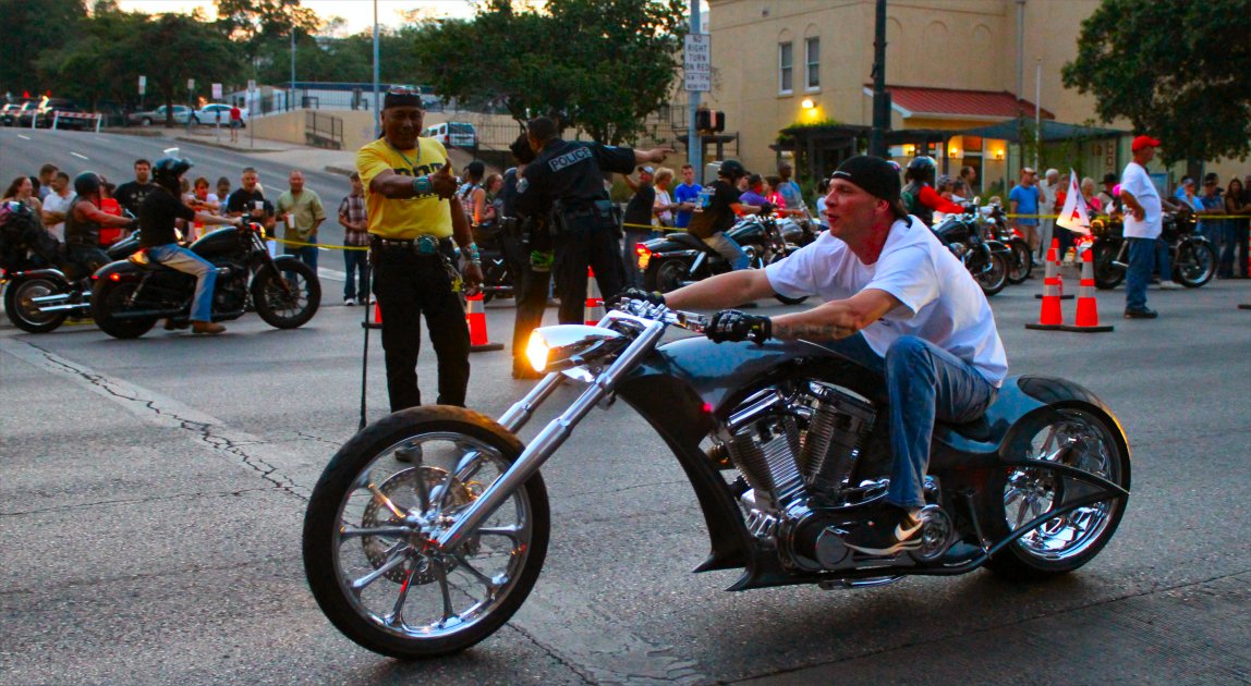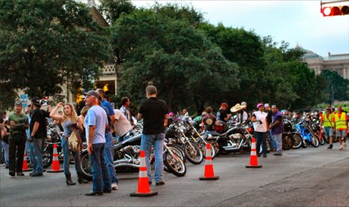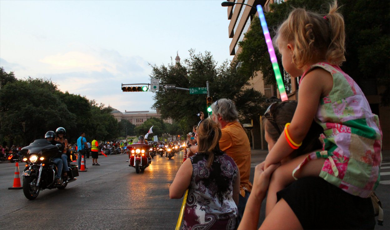 Each year, on Friday evening, participants in the motorcycle rally ride from the Austin fairgrounds into downtown in a bike parade that stretches more than 10 miles. MILES, people. And each year, My Baby and I take the grandkids downtown to watch the parade so they can see their Papi ride in. They get the biggest kick out of seeing him in the parade. It’s his rock star moment.