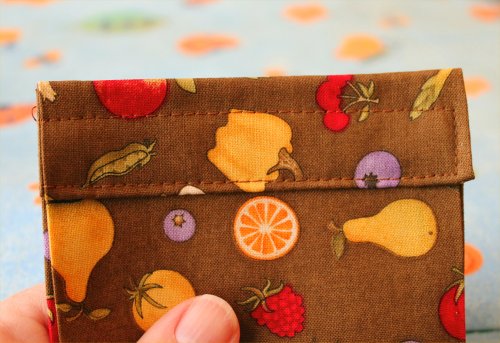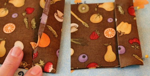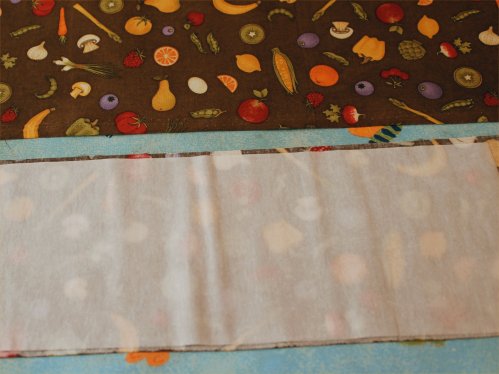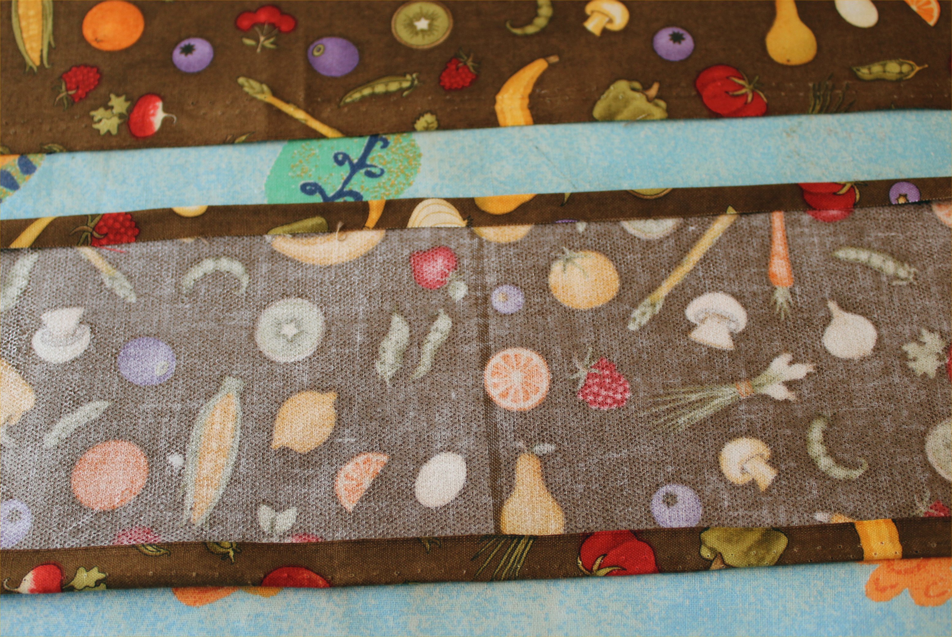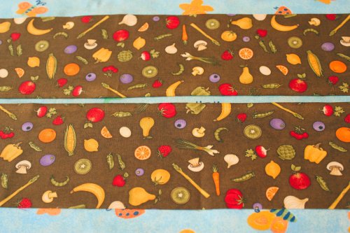 On an ironing board, lay out both strips of fabric and press them to remove all wrinkles. I chose this cute foodie fabric because I dream of becoming a better food photographer some day. Hey, you can’t stop a girl from dreaming.