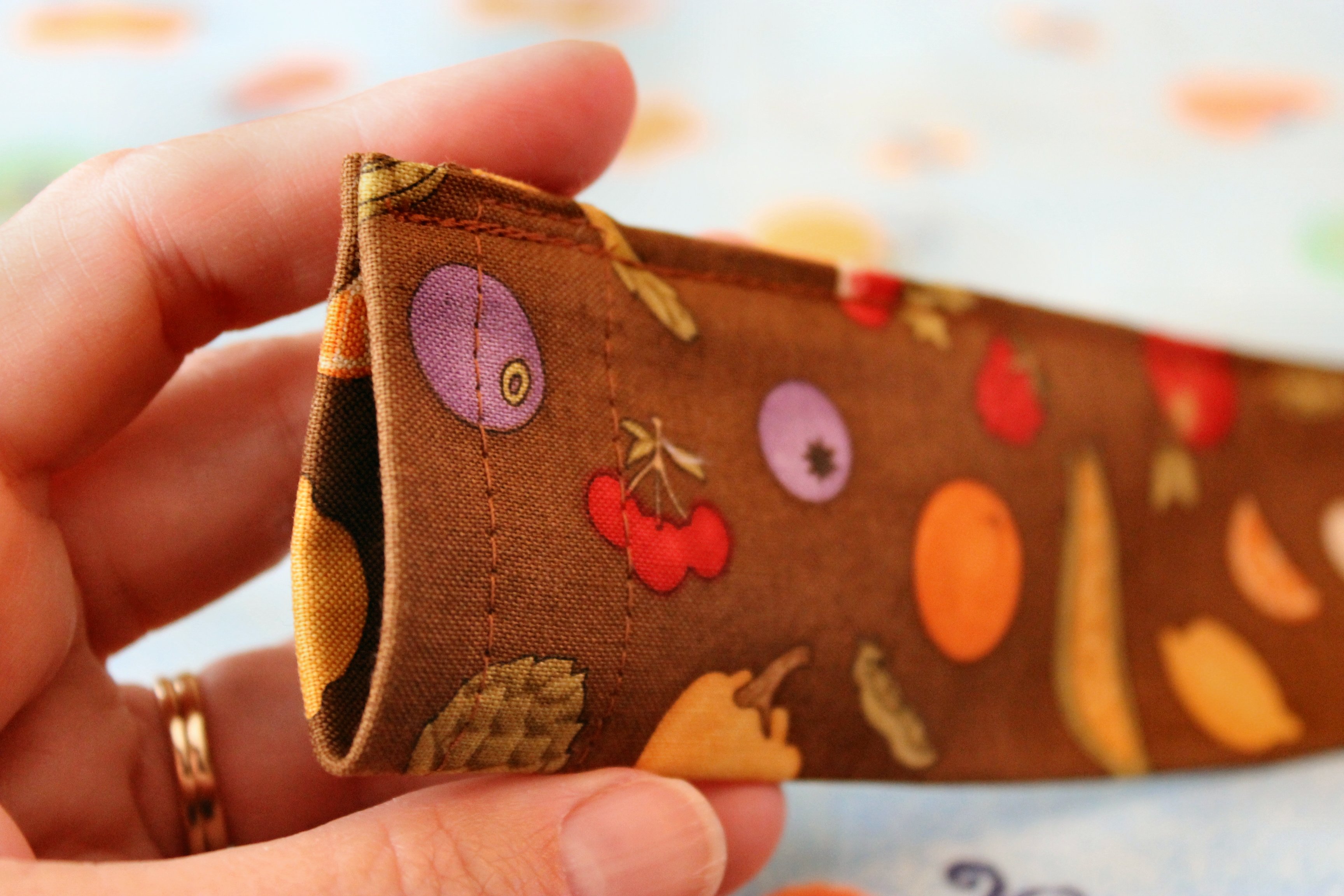 To finish both ends, fold the unfinished edge in approximately 3/4″ and press, then turn it under again another 3/4″, and pin it in place.