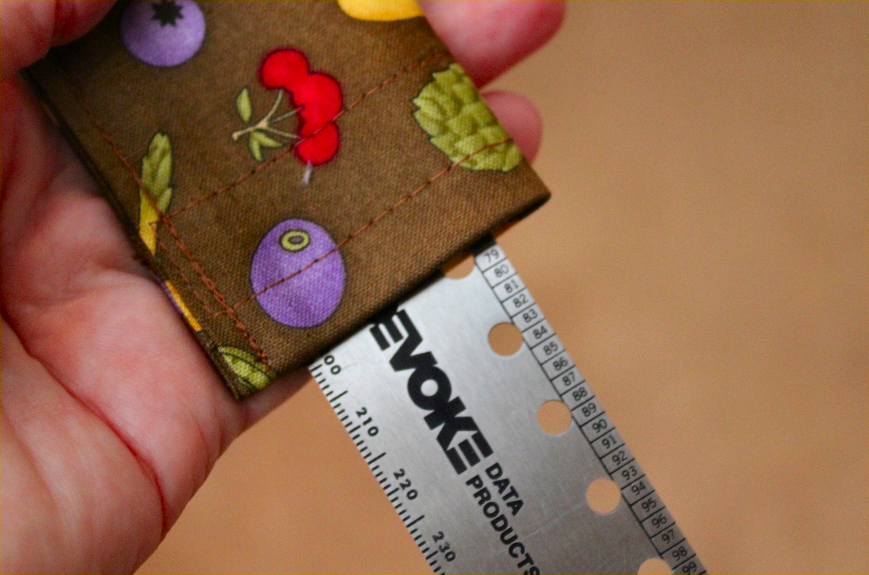 Congratulations! Your camera strap cover is now finished. If you’d like, throw it on the ironing board and give it one final press, then you’re ready to put it on your camera strap. The easiest way I’ve found to pull your camera strap through your new cover is to use a ruler with a hole in one end. Using a piece of twine or embroidery thread, tie your camera strap to the hole at the end of the ruler.