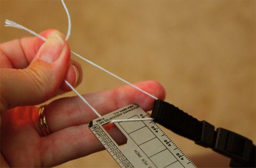 Feed the opposite end of the ruler into the camera strap cover, until it pops out the other end. Pulling gently on the ruler, thread the strap through the cover.