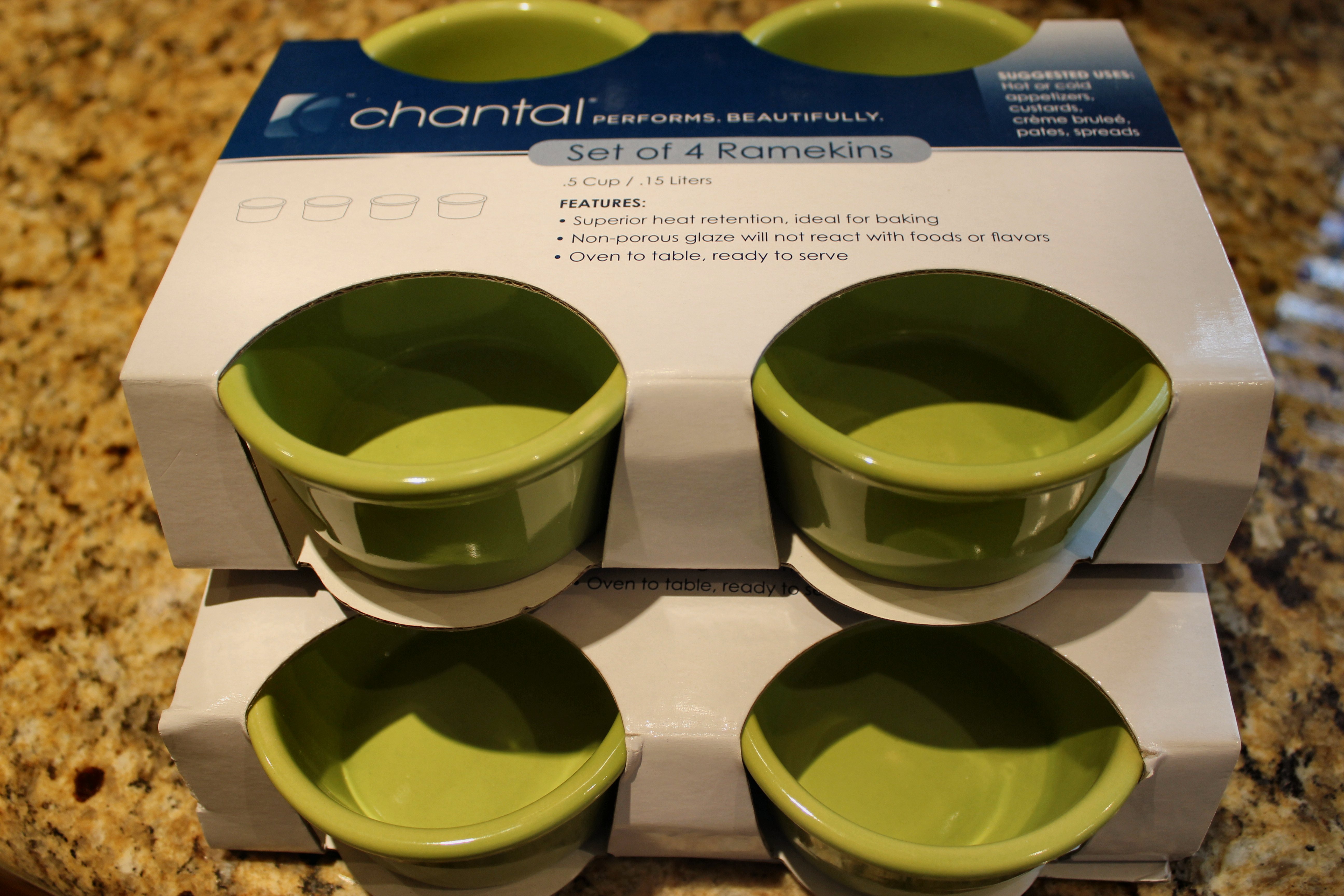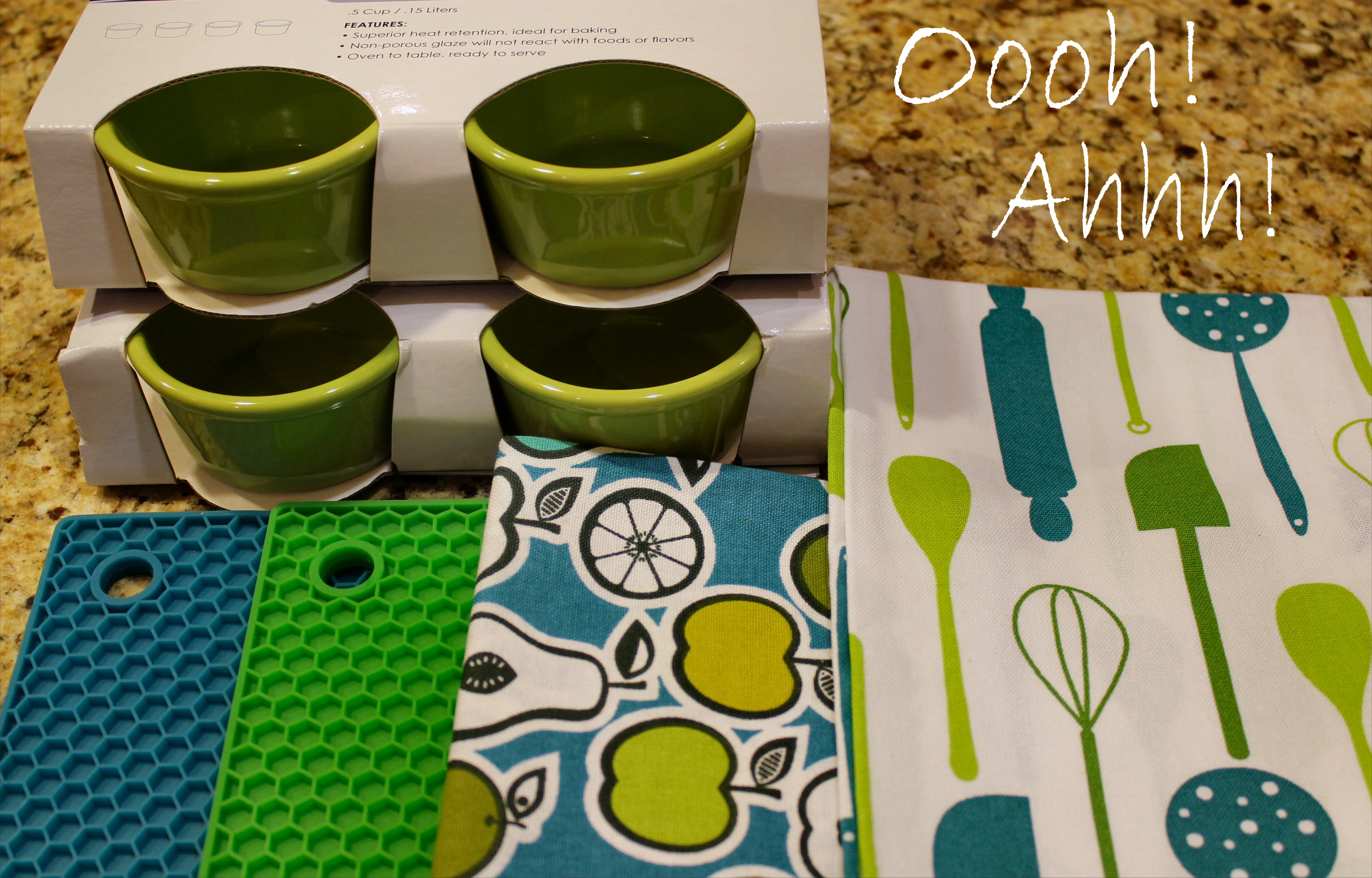 Congratulations to Cyndi from Arkansas. You are the winner of the Blue & Green kitchen giveaway. You’ve just won two (2) Crate & Barrel kitchen towels, eight (count ’em, 8) green Chantal ramekins, and two matching silicone hot pads/mats. I hope you enjoy your goodies! Thank you to all who participated.