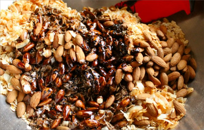 Start by lining two large baking sheets with parchment or Silpat mats. Spread the oats, almonds and coconut on baking sheets in a thin, even layer and toast at 350F for 10-15 minutes, or until the coconut is golden brown and the oats & nuts are fragrant. Remove from the oven and scrape the oats, almonds & coconut into a large mixing bowl; toss to combine.