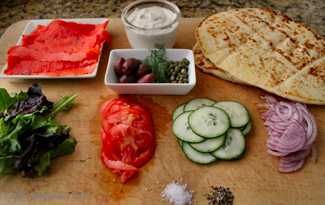 What to make, then? Well, something salmon. Obviously. And since we needed another entree, I decided to create a Greek Salmon Wrap in Megan’s honor.