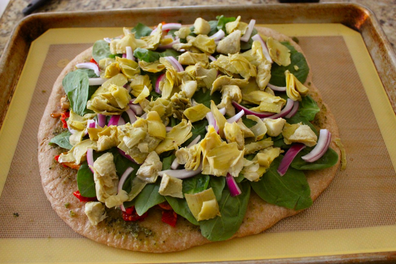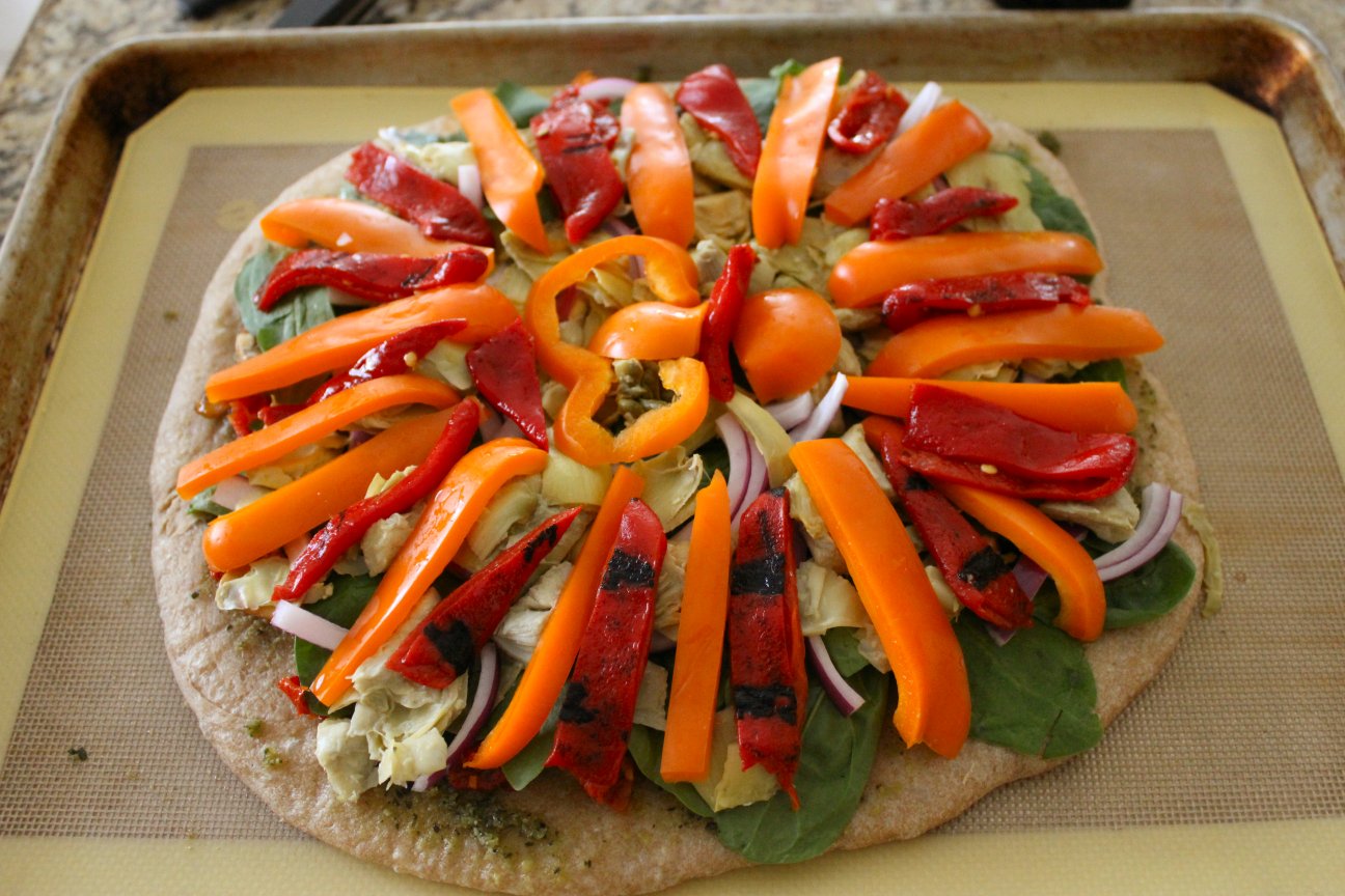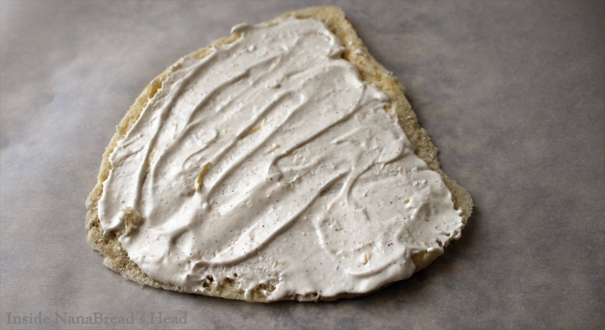 To start, lay one piece of flatbread on a sheet of parchment or waxed paper (which will make these a lot easier to roll later).