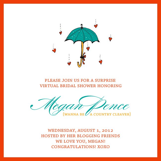 And she’s not just marrying any old guy. She’s gettin’ hitched to a sweet hunk-o-burning-love named Ben. They make such a cute couple and we’re so happy for them. I know you’re dying to see them together. To view Megan’s blog post with engagement photos, click HERE. To celebrate their big day, Megan’s blogging friends are throwing her a virtual bridal shower and I am thrilled particpate.