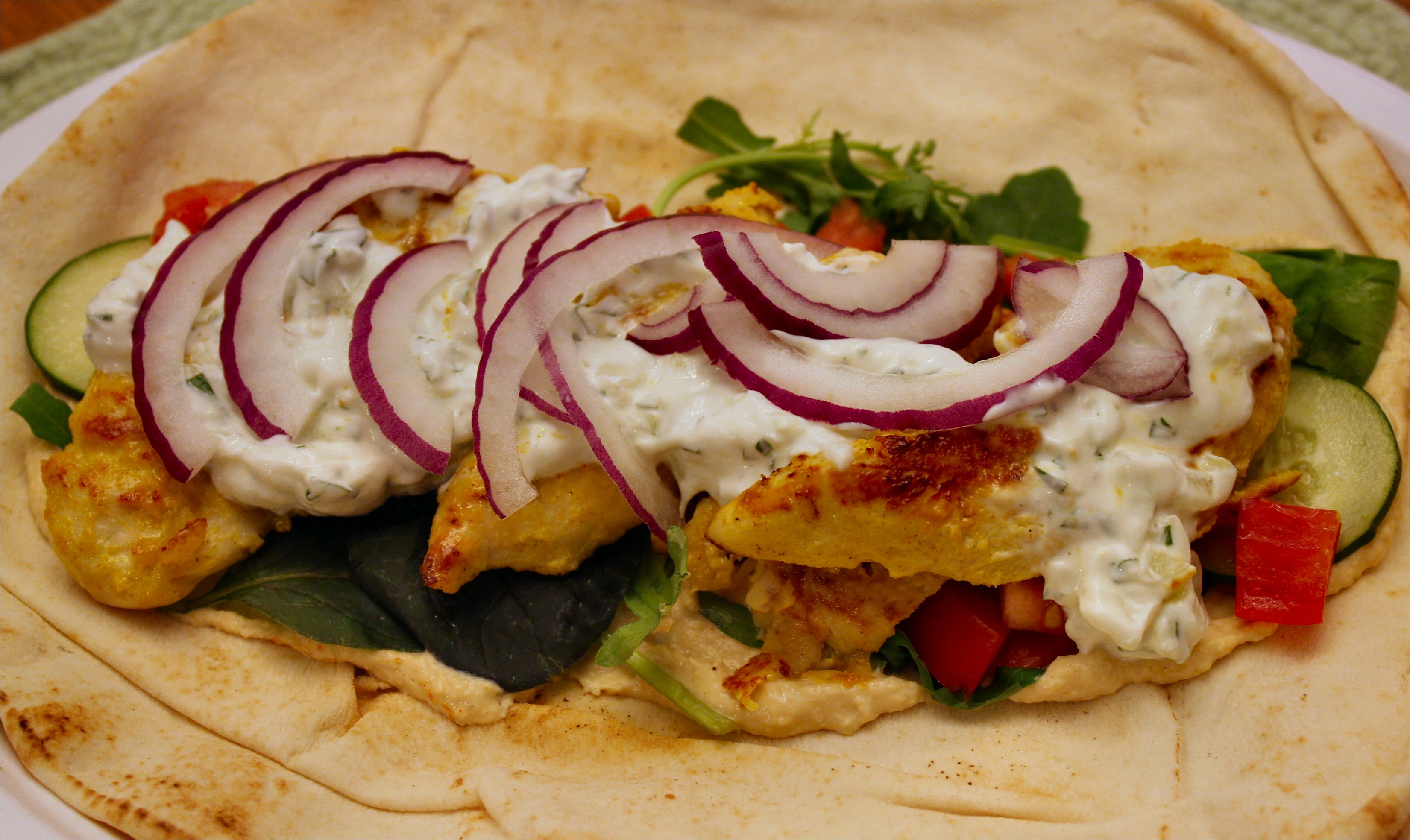 Now for the fun part – shawarma assembly. If you’re using a large, thin middle-eastern style pita, lay it out flat. If you’re using the smallish ones you find in most grocery stores, cut the top edge off and open it up. Give the inside of your pita a schmear of hummus. Top with chicken, then spoon on some tzatziki sauce. If you want, you can give it a shot of hot sauce or some sriracha chili sauce. That’s what I’ll be doing. Top with your choice of cucumber, tomato, purple onion and lettuce, then carefully roll up your pita and dig in. The verdict: loved it! I loved making all the different components. Loved that gorgeous marinade. Loved the tzatziki. Loved it all. I’ll definitely be making this again. It’s a keeper.