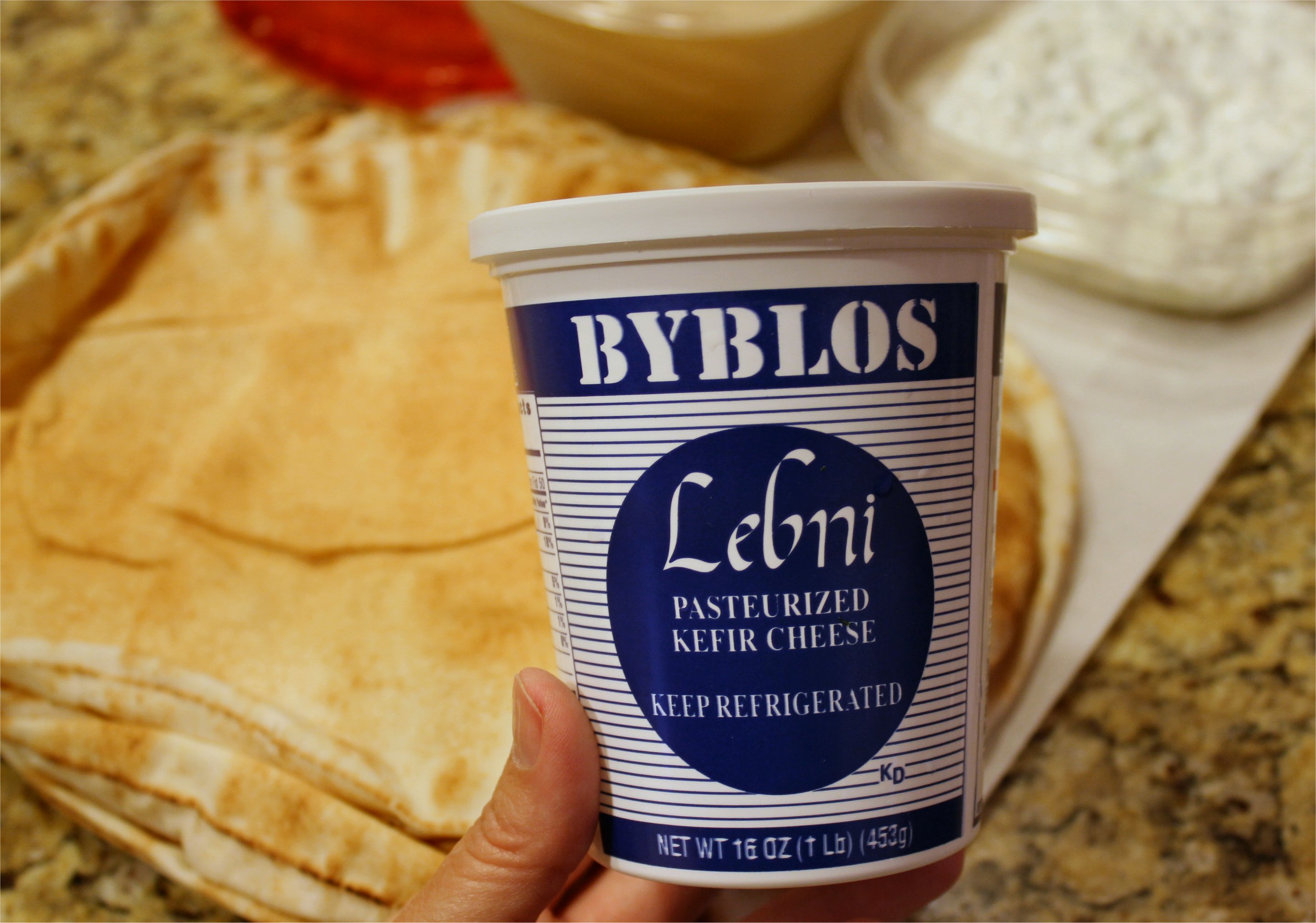 Now fast forward to our trip on Monday to our local Mediterranean grocer. If you remember, I mentioned it in my rambling Dr Pepper-induced rant about my new bargain designer purse from Macy’s. (Do I owe you an apology if you read that one? I feel like I might.) Anyway, The Complete Package and I dropped in for lunch and while we were there I browsed the grocery selection. What else is a girl to do while waiting for her gyro with extra feta and hot sauce? While browsing, I found garbanzos to make hummus with, the most fabulous bag of warm pita bread I’ve ever seen in my entire life, a small block of my beloved haloumi cheese, and the new love of my life – pasteurized kefir cheese. Have you seen this stuff? Have mercy – I’m in love. Big love. It’s like slightly soft, slightly salty cream cheese that melts in your mouth. It’s like Greek yogurt on steroids. It’s what my new Syrian buddy at the Mediterranean market recommended. My new bestest kefir eating buddy. We’re tight now.