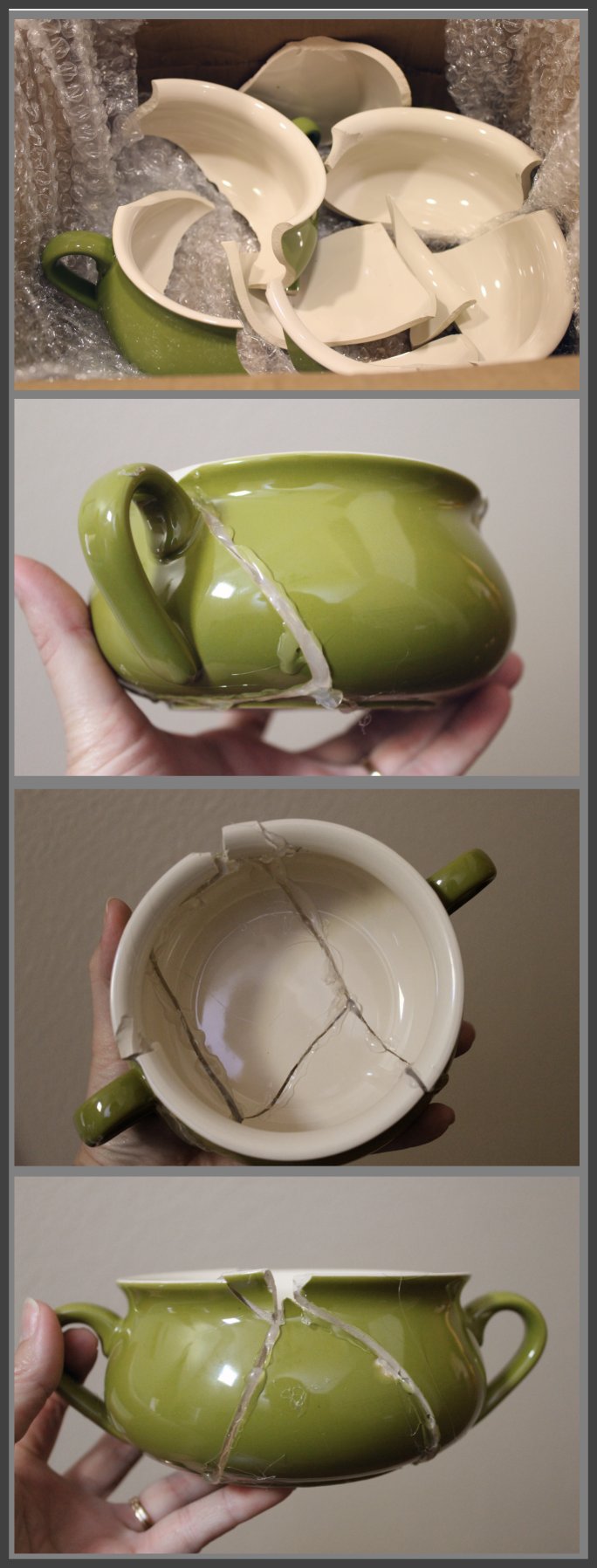 UPDATE: After much urging from The Complete Package, I’ve decided to add a photo collage of the broken chili bowls. Not because I want Megan to feel bad that they didn’t make it intact, but because of the hilarity that ensued when TCP tried to step in and save the day. Determined to “make this right”, he grabbed my hot glue gun and spent a good half hour trying to put my chili bowls back together again, Humpty Dumpty style. Reality was more in line with Megan’s Halloween theme, and so (with that in mind)… I give you the Frankenbowls.