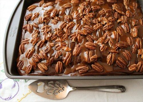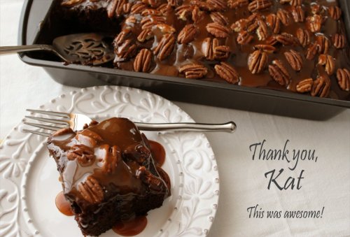 What? Still not sure? What if I show it to you like this? All sliced up and ready to face-plant into? Does that help? Did I mention it’s all soft and gorgeous on the bottom, and all fudgy and caramel-coated on top? Now are you interested?