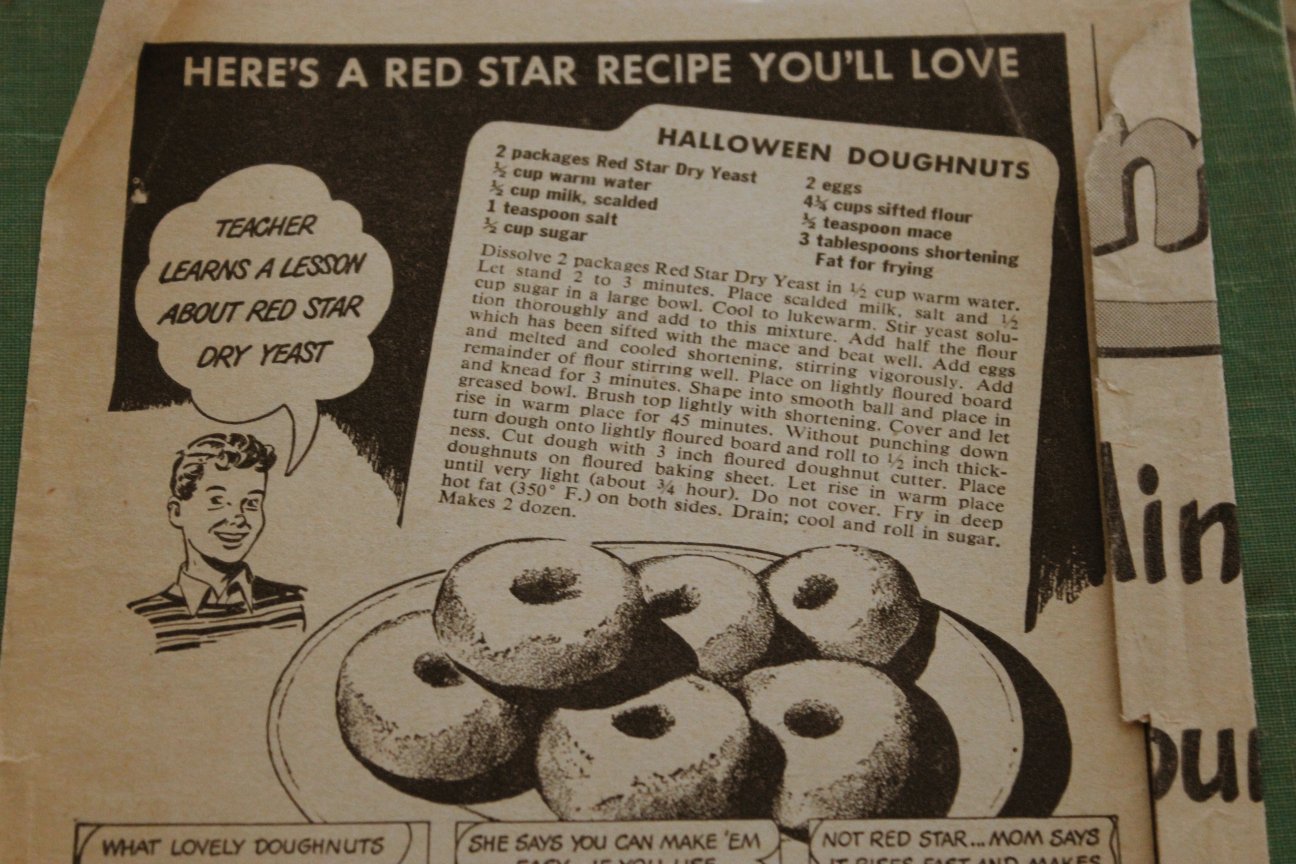 Another unexpected surprise: while flipping through the cookbook, this gem fell out. It’s a recipe from a magazine or newspaper circa the 1950’s, and it’s for Halloween Doughnuts. Just before Halloween, y’all! Talk about timing!