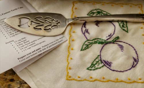 A vintage cake server & a handmade tea towel