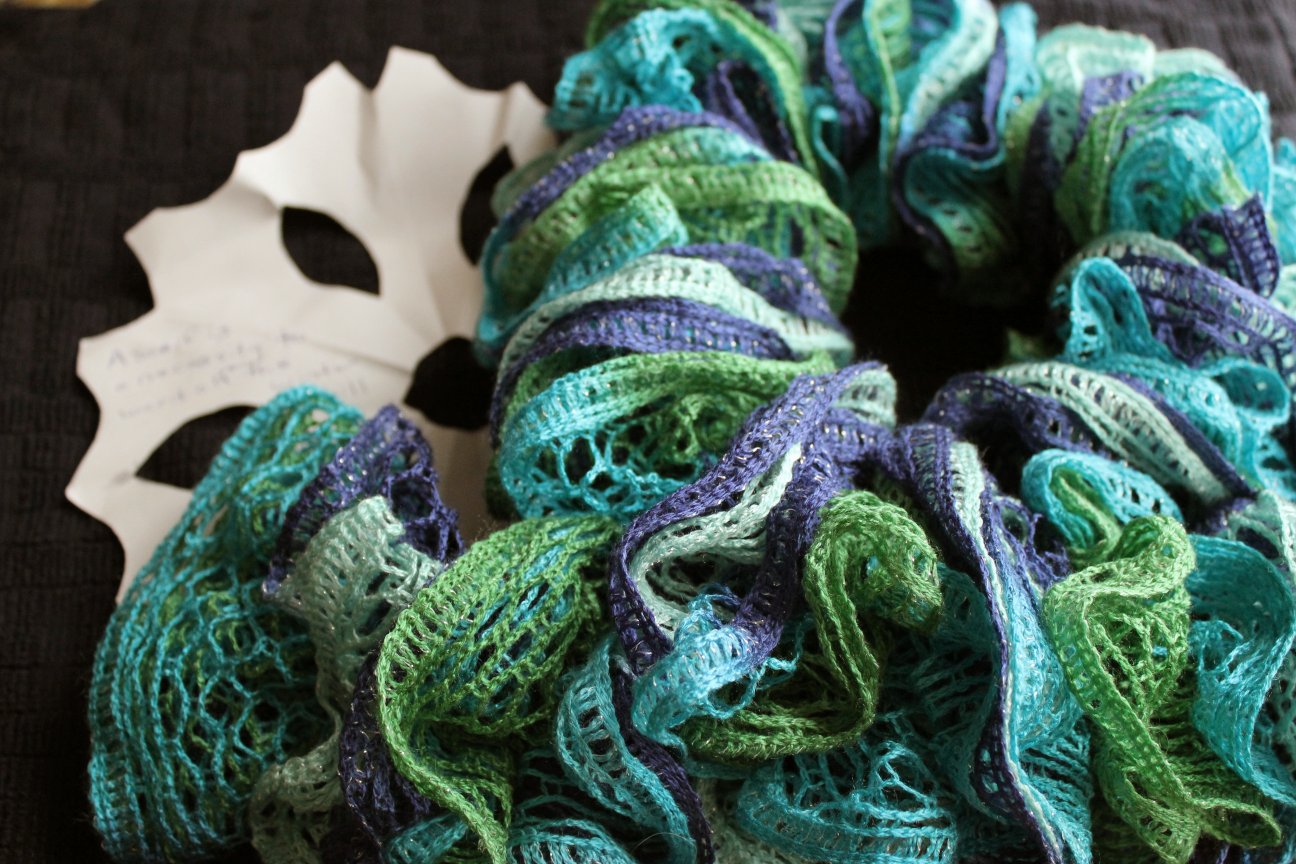 Not just ruffles, but ruffles with contrasting trim in black. And those buttons. They kill me. I don’t know how she did it. Well, actually there’s a story behind the gloves. If you look at the photo of the inside of the card again, you’ll see that little note on the top left corner about a funny story. It turns out that Kirsten crafted these gloves while they were traveling by car for Thanksgiving. She was so excited to get them done on the drive, she showed them to her husband, who commented “Did you mean to knit two left-handed gloves?” To her surprise, she’d accidentally made two lefts. She had to rip one apart and re-knit it into a right handed glove. She calls that a funny story. I would have cried.