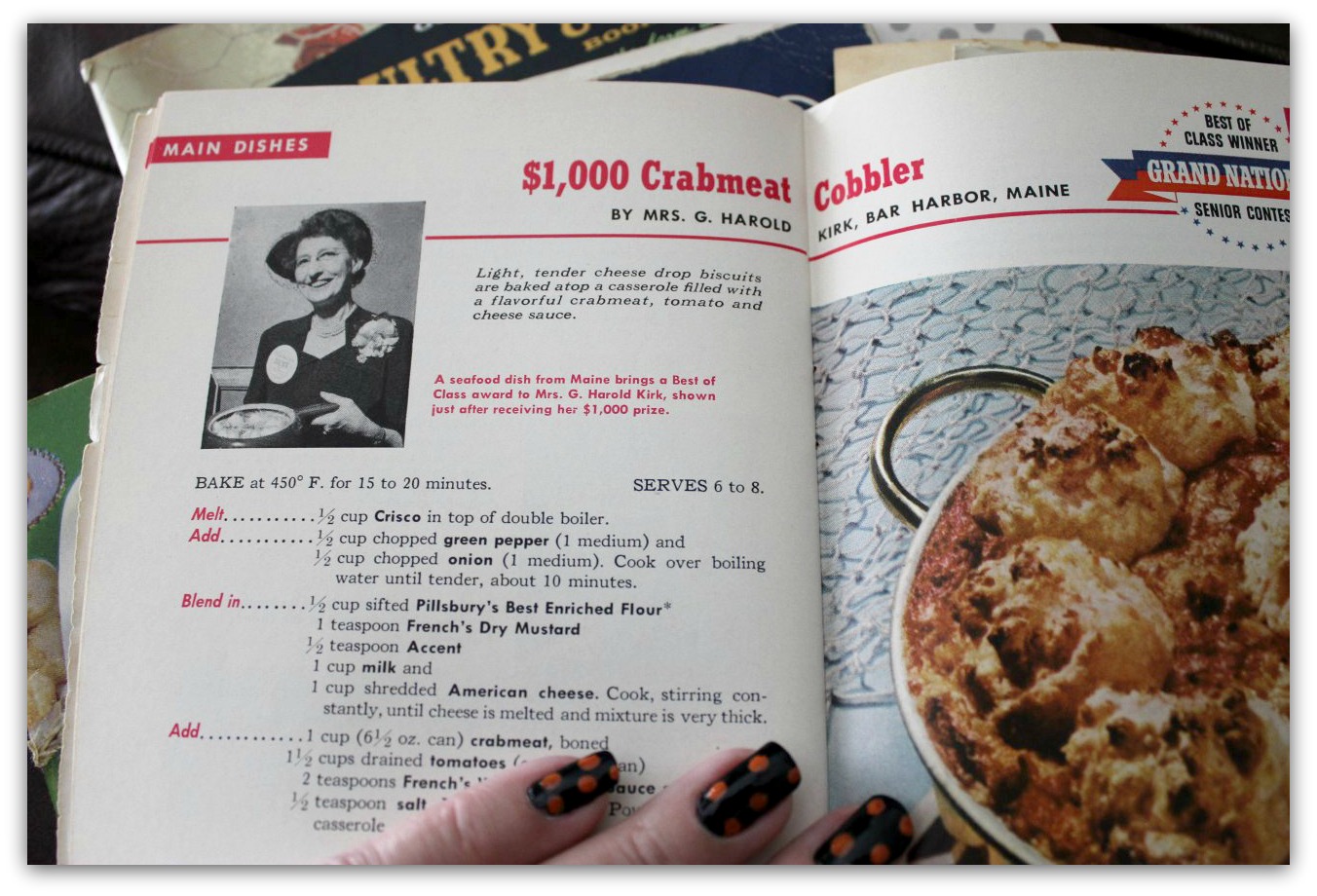 That’s the $25,000 winner from the second annual Pillsbury Bake-Off. From 1950. At the Waldorf Astoria Hotel in New York City. Amazing. Also stellar – Mrs. G. Harold Kirk of Bar Harbor, who knows how to dress for an occasion.