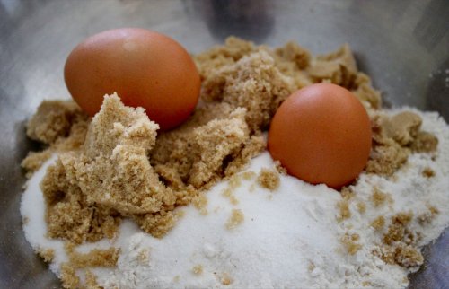 Pour the crumb mixture into a large mixing bowl and add the cake mix, eggs, coconut milk, vanilla and sugar. Just dump it all in there. No need to be delicate.
