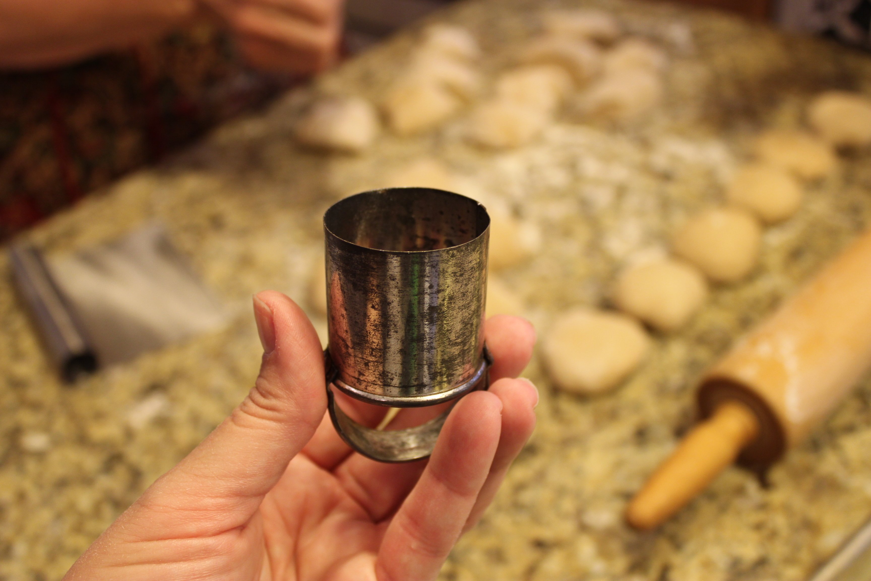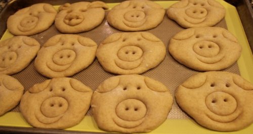 Now here’s the fun part: using a biscuit cutter approximately 1 1/2″ to 2″ in diameter and a fat wooden skewer, a chopstick, or a round wooden spoon handle, start to create your piggy faces. Feel free to unleash your inner arteest.