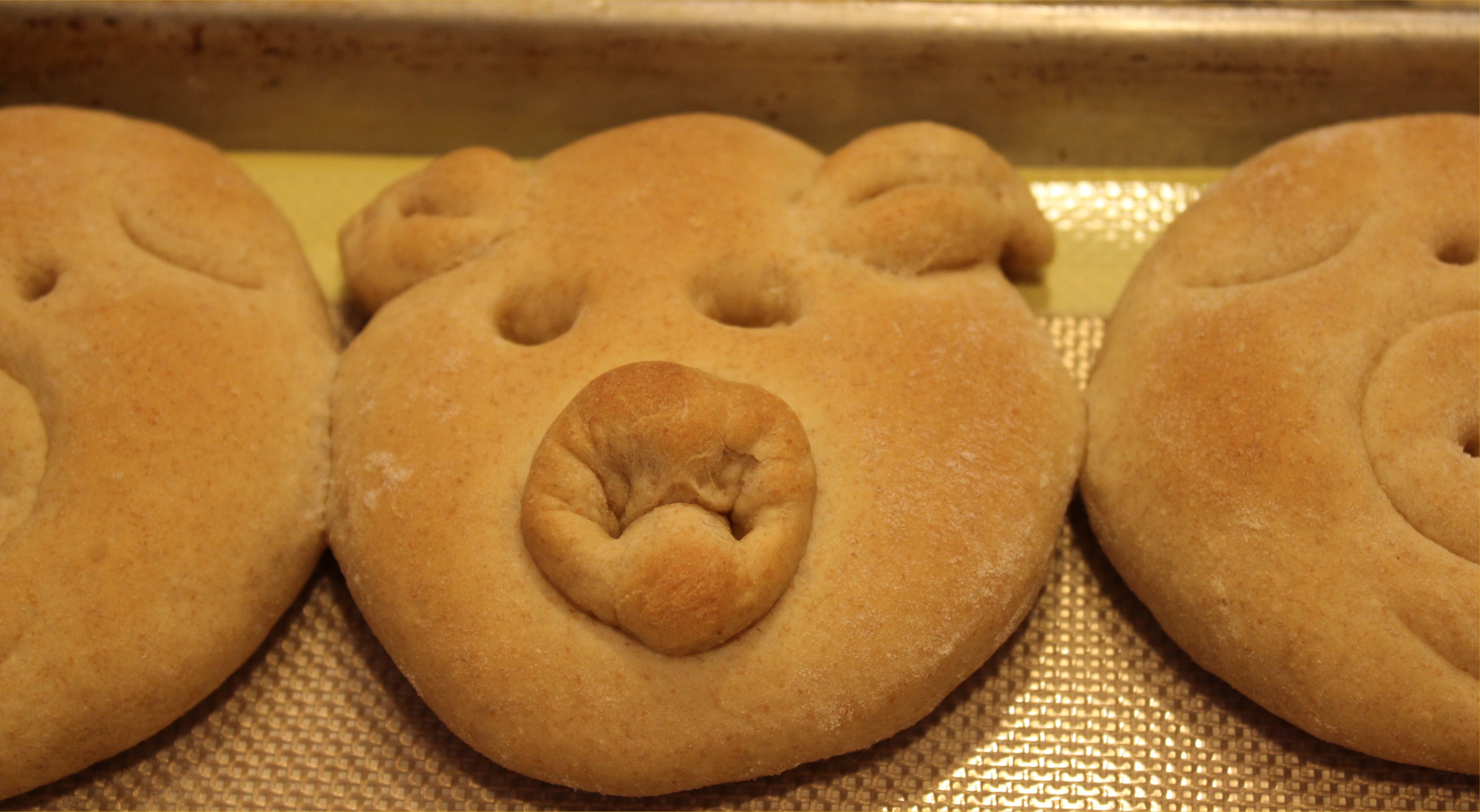 If you’re wondering if you could make these 3-D, the answer is YES! Big Sis made one just to see how it would turn out. It takes a little more work to shape the dough, and you have to wet it a little to make it stick, but you can make a 3-D snout and ears for your piggy. Pretty cute, huh? Pays to be an art major… metaphorically speaking, of course.