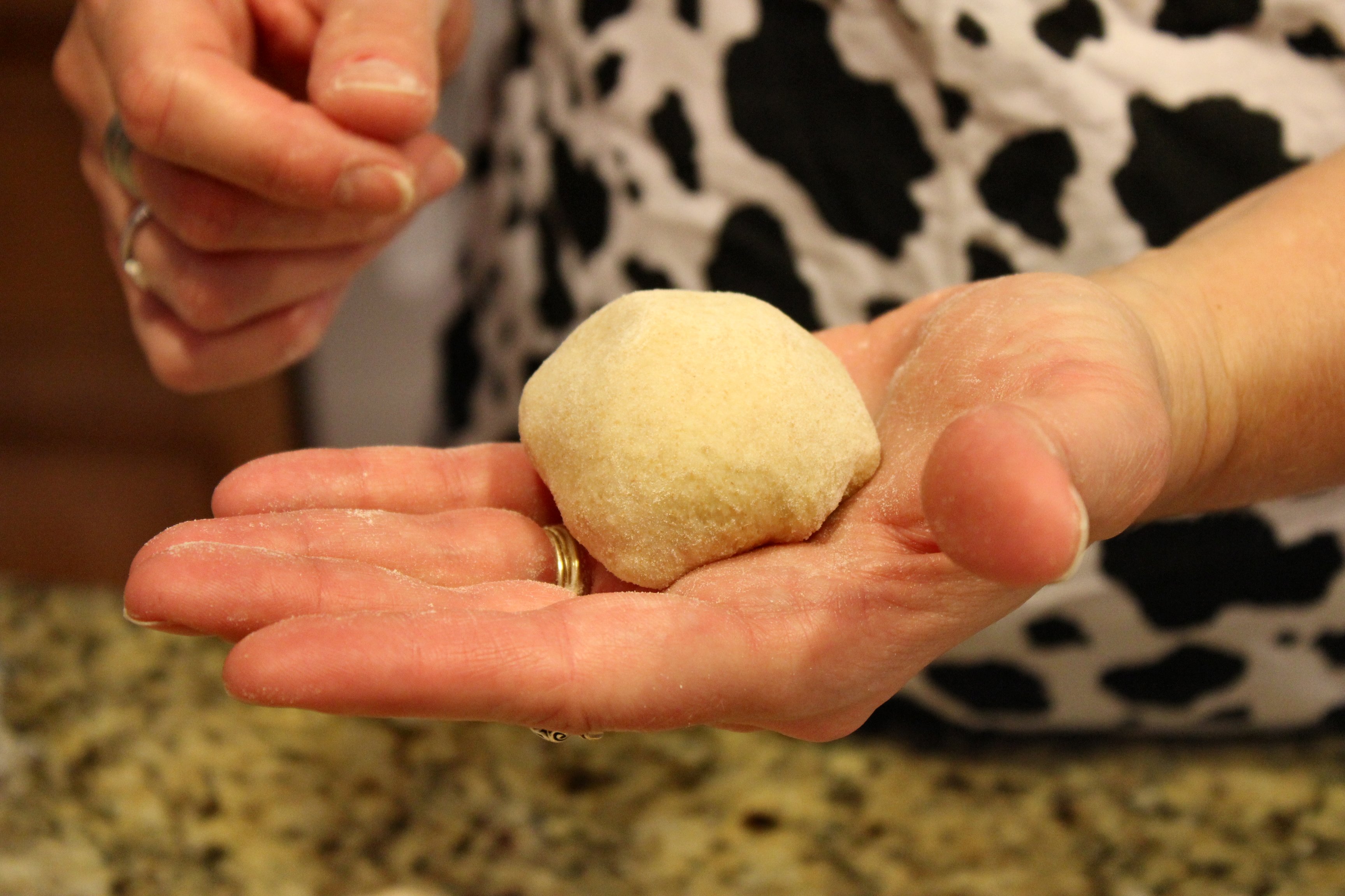Using a lightly floured rolling pin, flatten each ball into about a 1/4″ thick circle.