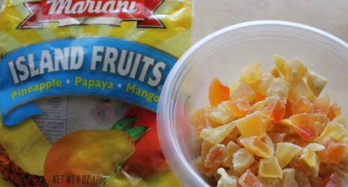 4. A bag of dried tropical fruits – mango, papaya and pineapple