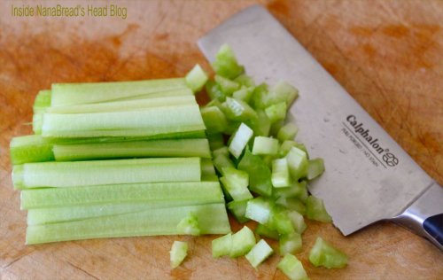Next, you’ll need two ribs (stalks) of celery. Cut off the tops and bottoms, wash them thoroughly, then cut them into thin sticks and chop into small pieces. We all know celery brings no real nutritional value, but what it does bring is crunch.