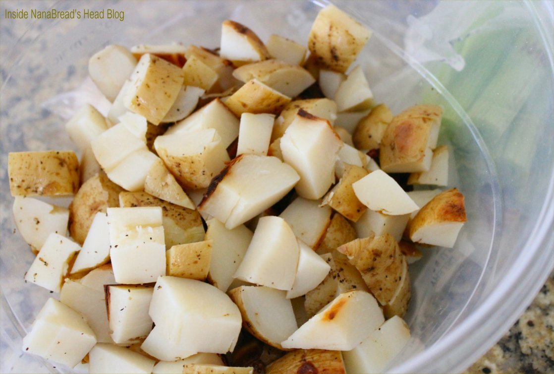 To start, grab 6-8 medium size white potatoes (the kind with thin skin) or 10-12 red new potatoes (about golf-ball size). I usually cover them with water in a saucepan and let them simmer until fork tender, but this week I had leftover roasted potatoes from Easter so I chopped those up. Either way works, so use whichever works best for you. Once your potatoes are fully cooked, let them cool then chop them into bite-size pieces and toss them into a mixing bowl.