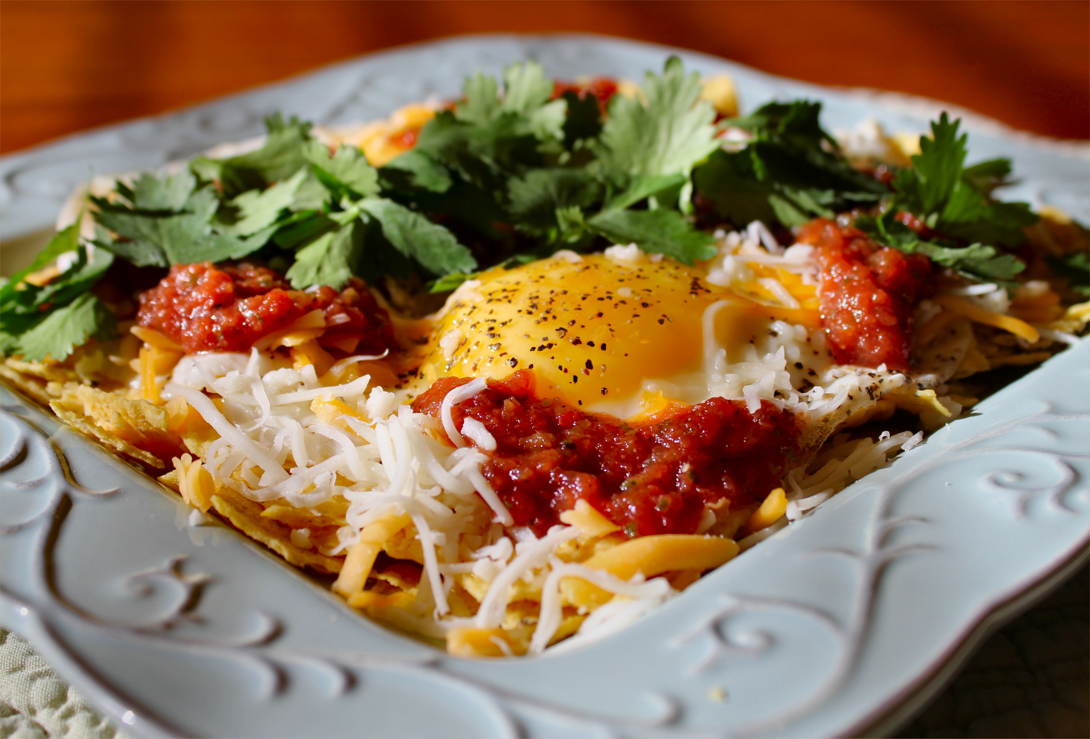Set out two plates. On each plate, arrange enough tortilla chips to cover half the plate as if you’re making nachos. If you want your chips to be more bite-sized, crunch them up a little before spreading them out. Spray a non-stick skillet with a little cooking spray and cook your eggs until the yolks are to your liking. I’ll be honest with you, this dish is best if you leave the yolks a little runny. Gently place 2 eggs on each plate on top of the bed of tortilla chips. Season with salt and pepper to taste. Sprinkle 1/4 cup of grated cheese on each serving, top each with one tablespoon of minced onion, pour 1/4 cup of salsa across each serving, then top with the cilantro. Put each plate into the microwave for 30-60 seconds on high to warm everything up and melt the cheese. Serve immediately. I like to serve this with pan-fried potatoes with onions or leftover refried beans. Out of salsa? Try it with pico de gallo instead. Want it spicy? Toss a fresh, minced jalapeno on the top or give it a few shakes of Tabasco. For me, this dish has it all – crunchy, creamy, salty, and spicy. It’s just fantastic. Whether you serve it for breakfast or dinner, Huevos Rancheros is sure to warm you up.