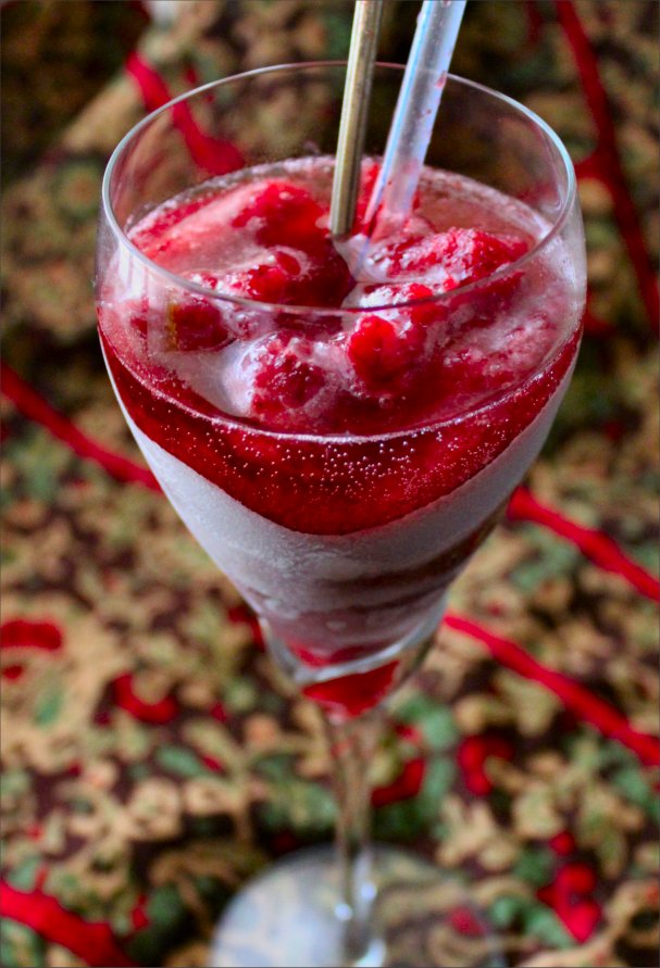 Begin by placing the lime juice, berries, sugar, booze & 3-4 mint leaves in a deep glass container. If you have a muddler, put it to good use. If not, use a sturdy wooden spoon and smash all the ingredients to a pulp. Literally. Place the container in the fridge and allow your fruit sludge to chill for at least one hour. The theory is to let the fruit macerate in the booze and sugar until the flavors are beautifully infused.