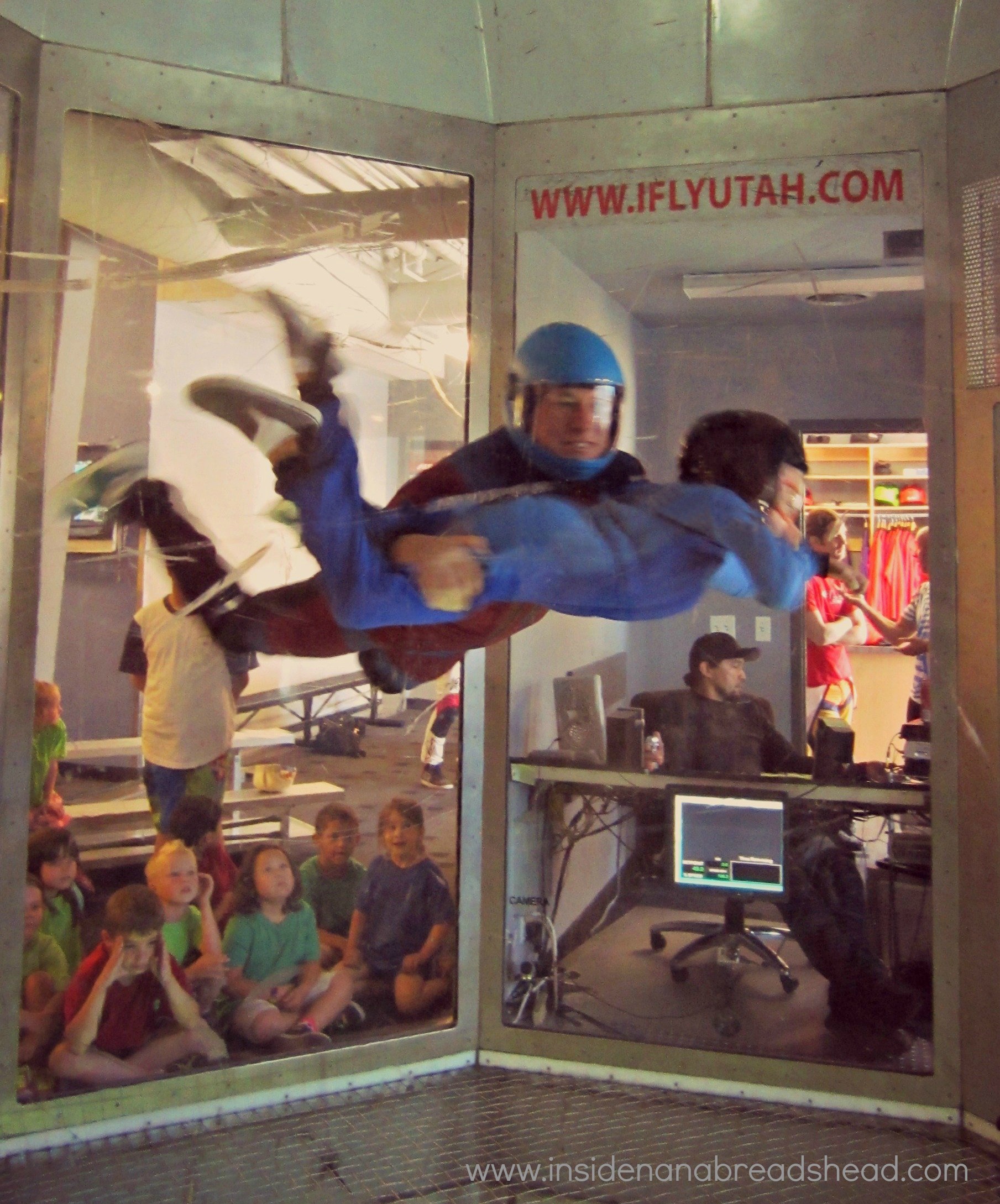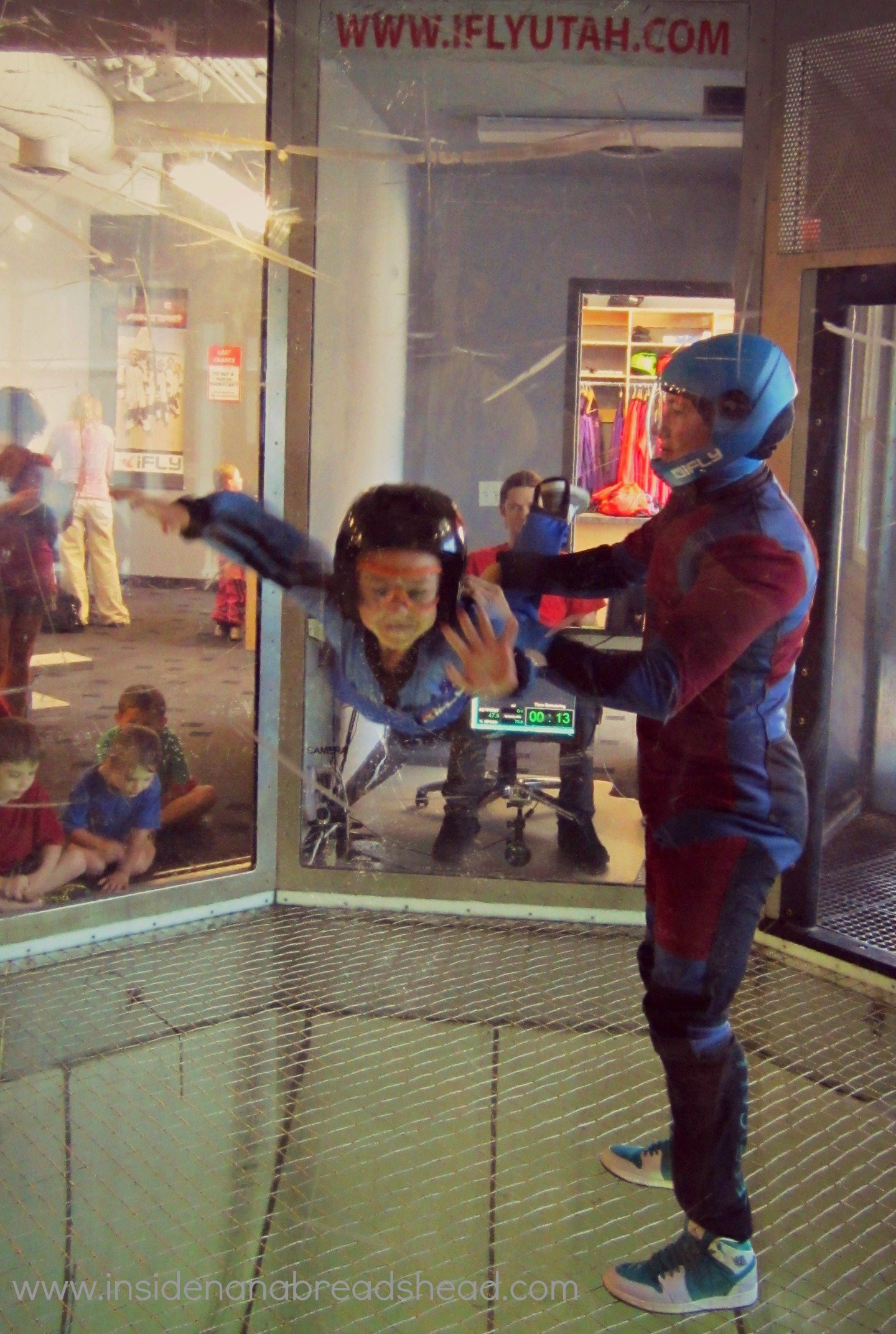 We talked about this with the kids before we left for Utah and at that point, both Jonah & Lilly planned to participate. After our museum wind tunnel experience, however, Lilly opted out and Jonah went full steam ahead. After sitting through the training video with a room full of adults, Jonah suited up and was ready to fly. He looks so grown up to us at seven, but next to his flying group, he looked so tiny. Still, he was pumped about getting into that air chamber while some of the teens in his group were nervous. Here’s our fearless flyer.