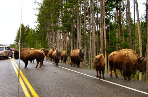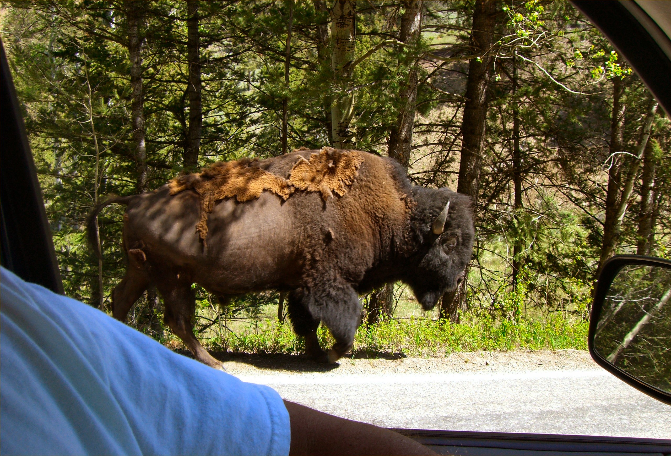 See that gray bar in the bottom left corner? That’s the frame of our car window. This guy was in the middle of the road and close enough to touch. We would never do that (without wetting our pants), but that’s how close he was. Oh, and for the city slickers – never fear! You can still enjoy encounter traffic issues. Sometimes it’s due to the number of tourists in the park, but sometimes it’s due to a more specific type of traffic issue – a bison jam. And no, I’m not kidding.