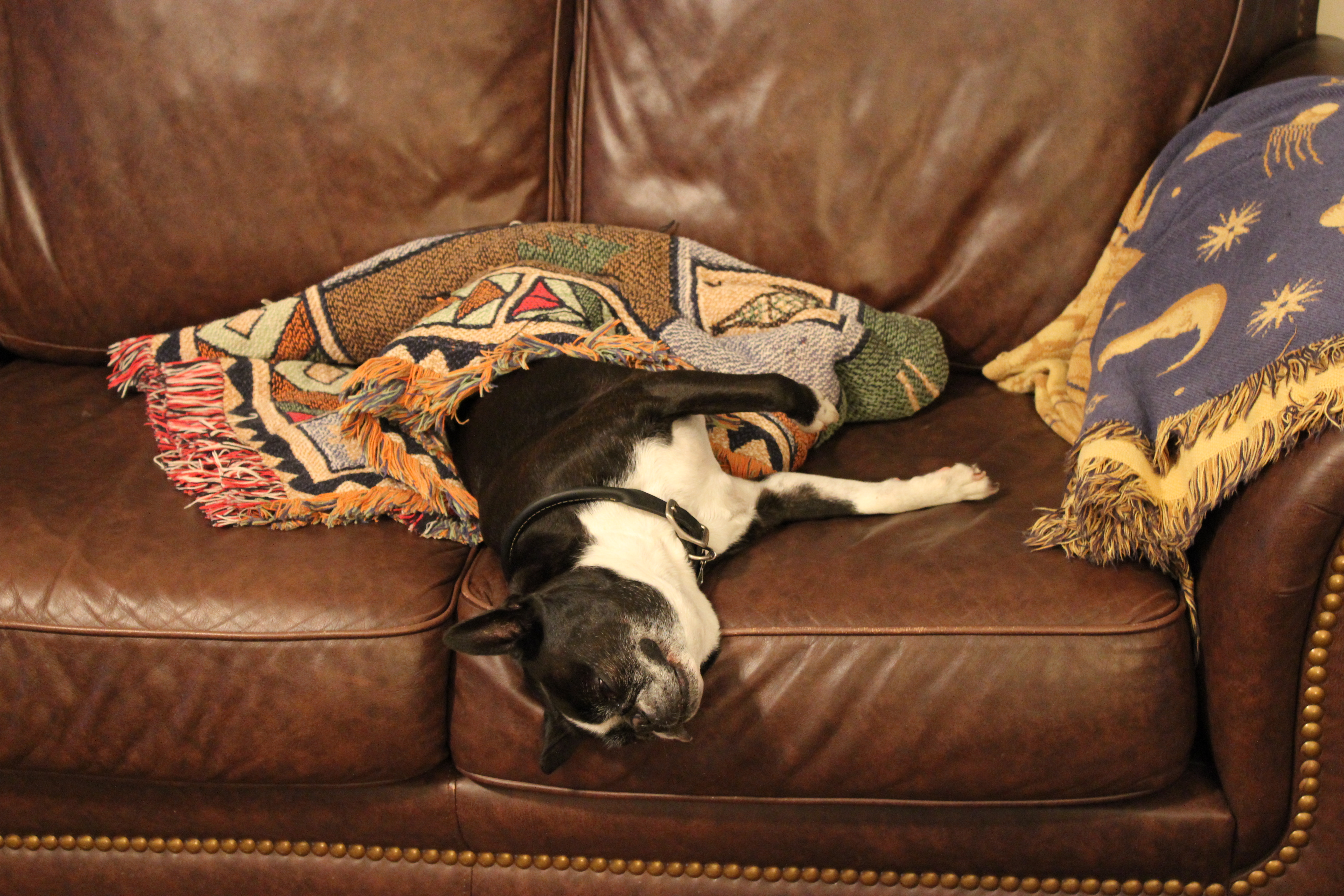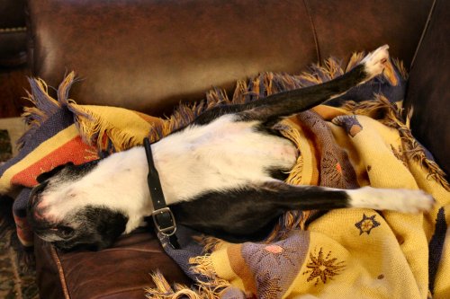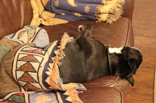 This is how Ziggy likes to nap…covered in a blanket on our leather sofa. No, he’s not spoiled. Why do you ask? It worries me that he hangs his head off like this. I’m afraid he’s going to slide right off the couch one day and land on his head.